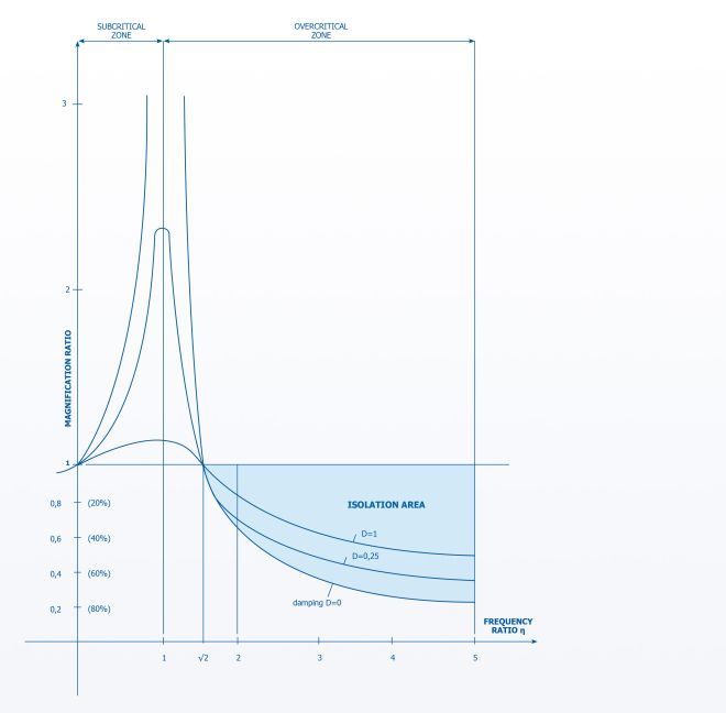 On considère le rapport de fréquence entre l'excitateur et la fréquence propre. L'atténuation de l'isolant joue également un rôle décisif, comme le montre la fonction de transfert ci-contre. L´ effet isolant est obtenu pour un rapport de fréquence supérieur à √2. Si le rapport est plus faible, des forces d'interférence peuvent même être générées, augmentant la vibration du système. En règle générale, un rapport situé entre 3 et 4 est visé. Des valeurs plus élevées peuvent également être atteintes pour des exigences particulières, mais elles sont techniquement et économiquement limitées.