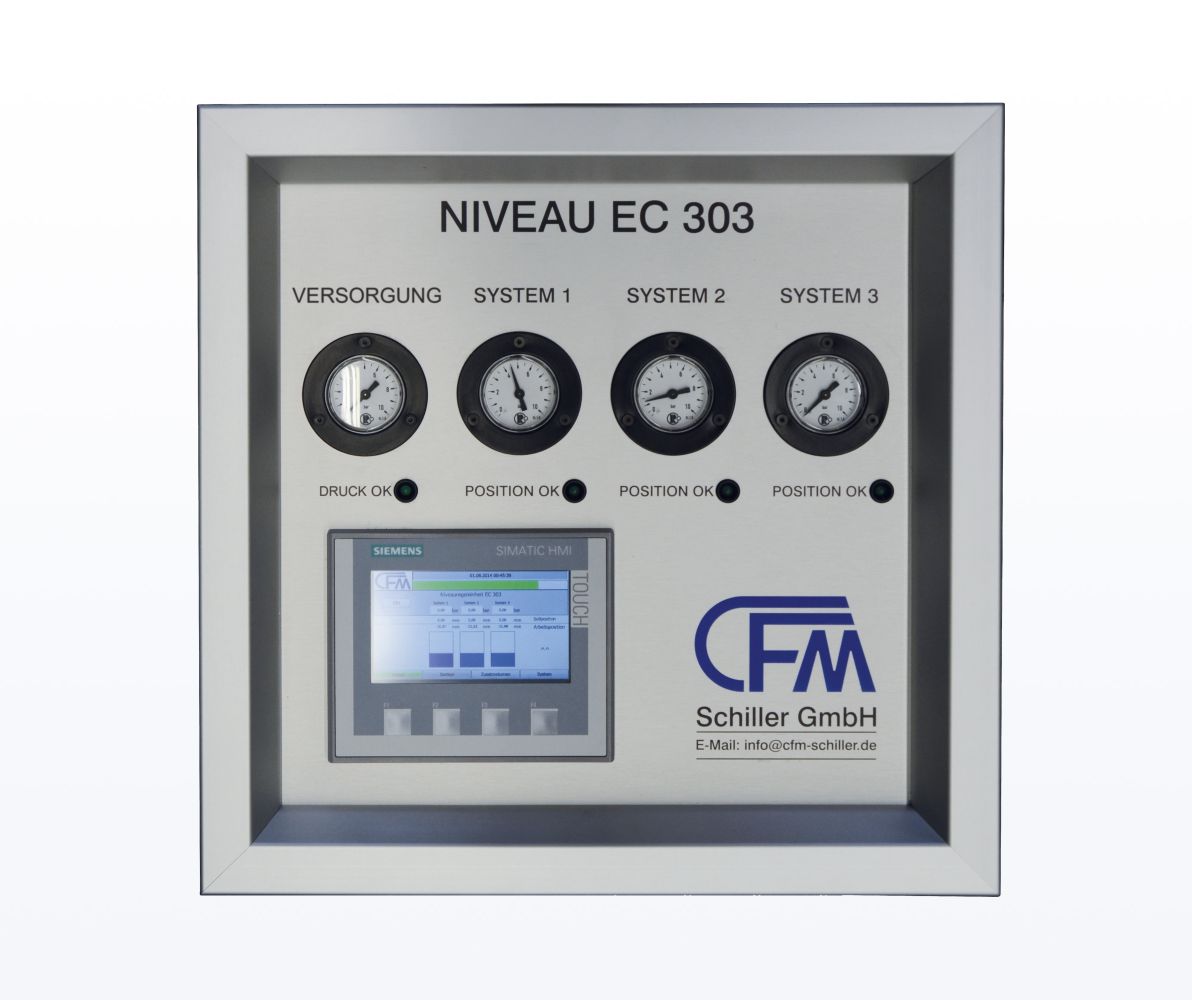 Die elektronische Niveauregelung Typ EC 303 dient zur automatischen Niveauregelung von lagegeregelten Luftfedersystemen. Diese 3-Punkt Regelung kann mit allen CFM Luftfedern verwendet werden. Die EC 303 besteht aus dem elektronischen Lageregler sowie drei Ventilbaugruppen mit Digital/Analog Drucksensoren mit 7-Segmentanzeigen, die in ein Industriegehäuse integriert sind. Die Frontplatte einhaltet die Manometer zur Überwachung des Eingangsdrucks sowie der einzelnen Systemdrücke.