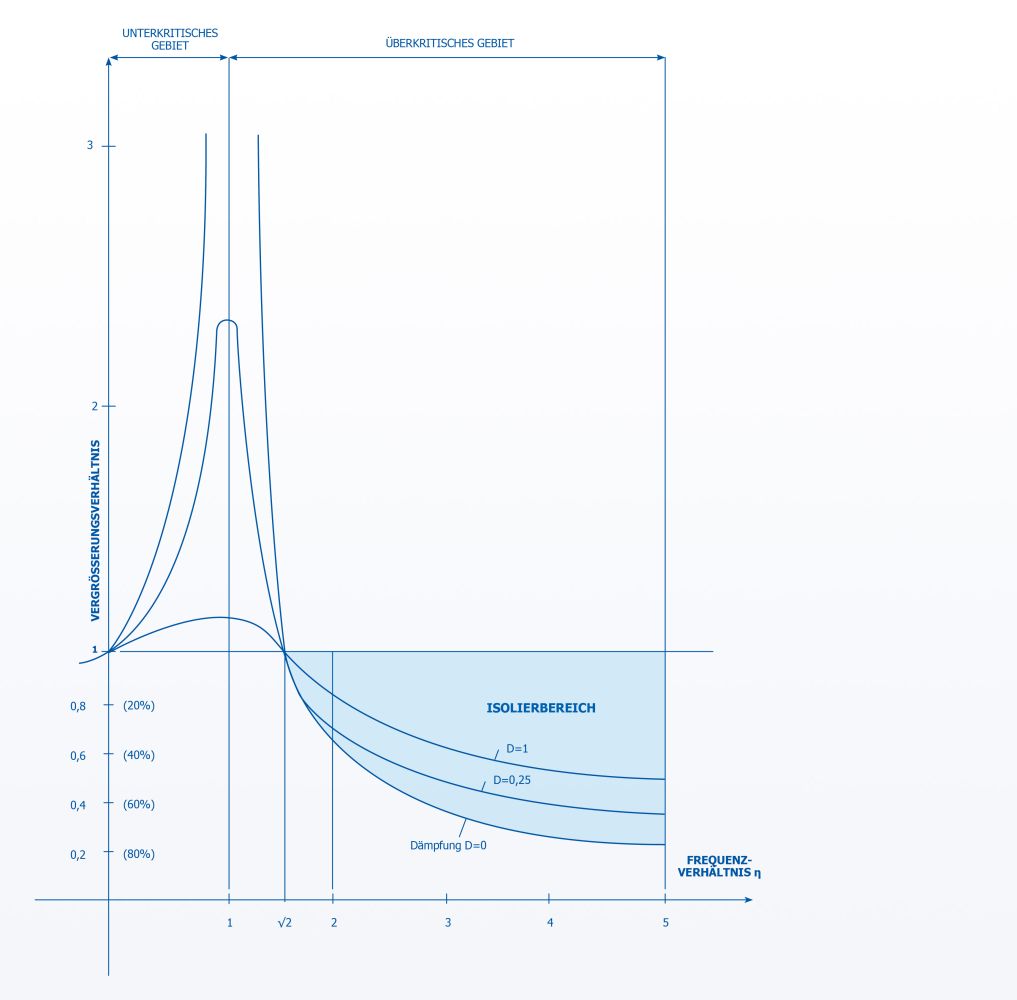 Man betrachtet das Frequenzverhältnis zwischen Erreger- und Eigenfrequenz. Auch die Dämpfung des Isolators spielt eine entscheidende Rolle, wie die abgebildete Übertragungsfunktion zeigt. Erst ab einem Frequenzverhältnis >√2 findet eine Isolierwirkung statt. Bei kleineren Werten kann es sogar zu einer Überhöhung der Störkräfte kommen. In der Regel wird ein Abstimmverhältnis zwischen 3 und 4 angestrebt. Für besondere Anforderungen lassen sich auch höhere Werte erzielen, die allerdings sowohl technisch als auch wirtschaftlich an ihre Grenzen stoßen.