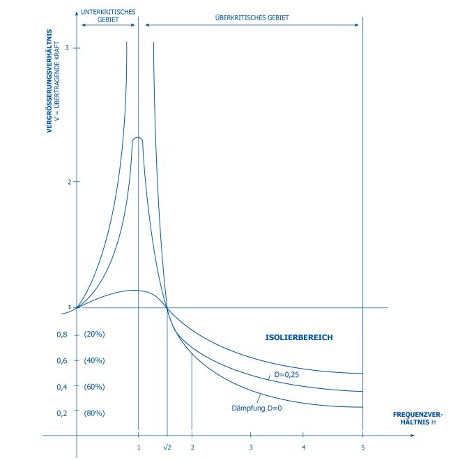 Die Güte der Schwingisolation ist maßgeblich abhängig von Verhältnis der Erregerfrequenz der Störquelle zur Eigenfrequenz des Isolators und dessen Dämpfungseigenschaften. Je niedriger die Eigenfrequenz des Isolators ist, desto besser ist der Isolierwirkungsgrad. Die abgebildete Übertragungsfunktion zeigt anschaulich, dass eine wirksame Schwingisolierung ab einen Frequenzverhältnis von größer √2 gegeben ist. Liegt das Frequenzverhältnis darunter, erfolgt sogar eine Vergrößerung der Störkraft (Resonanzüberhöhung). Um einen optimalen Wirkungsgrad der Isolierung zu erreichen, ist idealerweise ein Abstimmverhältnis von 3-4 zu wählen.